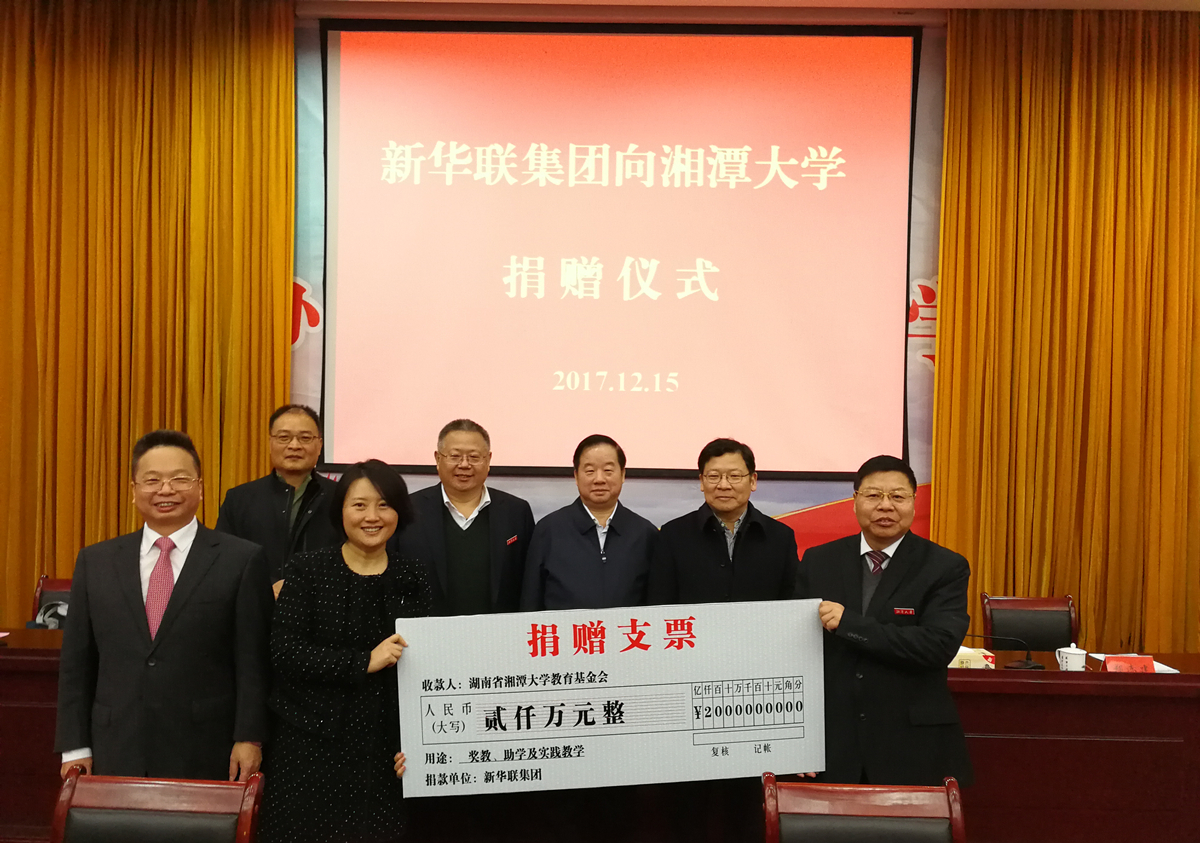 繼捐贈(zèng)中南大學(xué)、湖南第一師范學(xué)院和北京外國(guó)語(yǔ)大學(xué)之后,新華聯(lián)集團(tuán)又向湘潭大學(xué)捐贈(zèng)2000萬(wàn)元用于獎(jiǎng)教助學(xué)。12月15日上午,捐贈(zèng)儀式在湘潭大學(xué)逸夫樓第一報(bào)告廳舉行。新華聯(lián)集團(tuán)董事局主席兼總裁傅軍與湘潭大學(xué)黨委書記黃云清、校長(zhǎng)周益春,湘潭市委書記曹炯芳等出席捐贈(zèng)儀式。