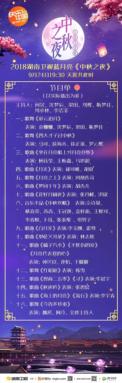 9月24日19:30,湖南衛(wèi)視2018中秋晚會精彩上演。今年的晚會全程在長沙新華聯(lián)銅官窯古鎮(zhèn)戶外實景錄制,李宇春、華晨宇、林志炫、佘詩曼、鐘漢良、韓雪、張碧晨、袁姍姍、羅云熙等明星大咖云集銅官窯古鎮(zhèn),與觀眾共度一個“星”光璀璨、亮點紛呈的“中秋之夜”。