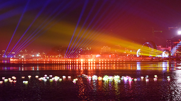 “中秋之夜”晚會以“天涯共此時”為主題,精心設(shè)置了主、副兩個舞臺。主舞臺以銅官窯古鎮(zhèn)水秀景觀為主體。波光粼粼的湖水、絢爛多彩的燈光、皎潔明亮的月色,恰到好處的倒影,共同營造出“水天一色,水月中秋”的詩情畫意。副舞臺設(shè)置在熱鬧的銅官美食街。街上有吹糖人、拉洋片、捏泥人等非物質(zhì)文化遺產(chǎn)項目以及舞火龍、手工月餅、花燈等中秋節(jié)傳統(tǒng)民俗,還原古人過中秋的情節(jié)。銅官窯古鎮(zhèn)優(yōu)美的意境、深厚的文化底蘊與中秋佳節(jié)花好月圓人團圓的氣氛完美融合,相得益彰。
